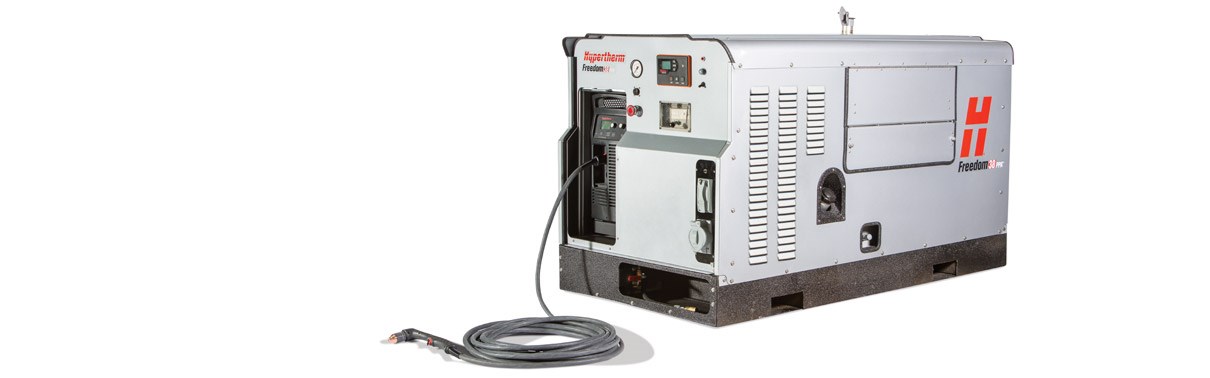 The Hypertherm Freedom 38 PPA is an engine-driven, fully self-contained plasma system designed for cutting and gouging work in remote locations. The unit combines a Powermax 125 plasma system with a 38 kilowatt generator and air compressor.